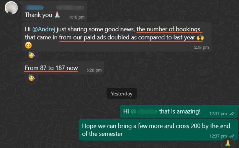 “We have officially closed the cohort because we are FULL!!!!! Thank you both so much for helping us with such a successful cohort launch!!!! These are our best enrollments yet. We had 52 enrollments with one drop. We will likely have a few more drops during the 7 day window but we were originally aiming for 32 and landed at 51. WOOHOO!!!!!” - Shawntay, Founder @ IDC